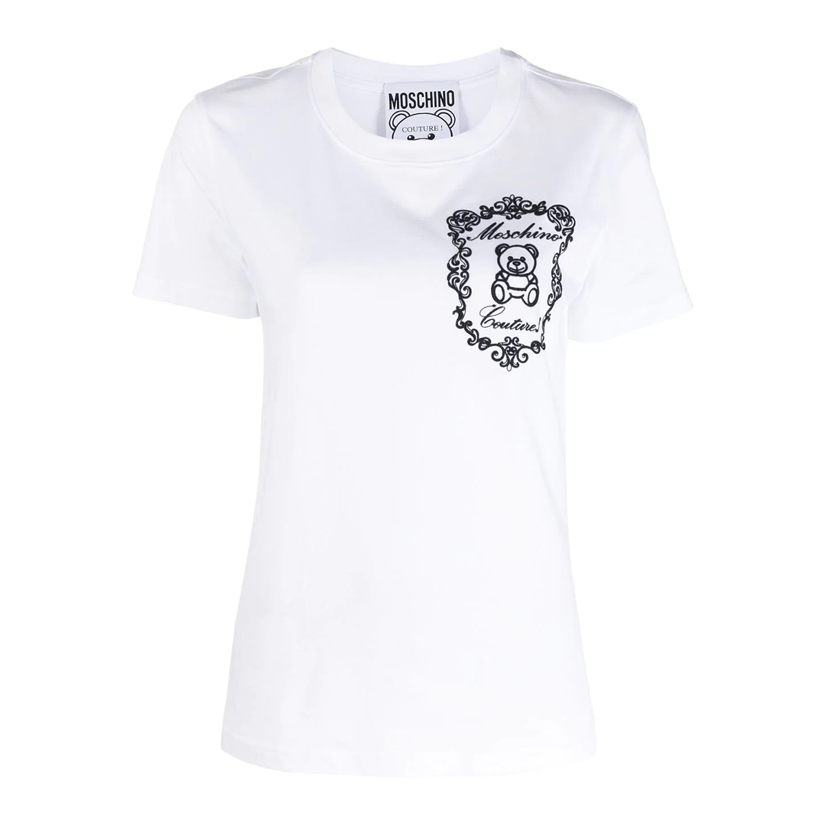 Teddy emblem T-shirt from MOSCHINO featuring white, cotton, signature Teddy Bear motif, round neck and short sleeves.