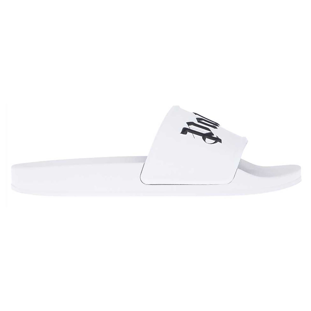 POOL SLIDER IN WHIE WITH "PALM ANGELS" LOGO IN WHITE PRINTED AT FRONT. OPEN TOE AND FLAT RUBBER SOLE.