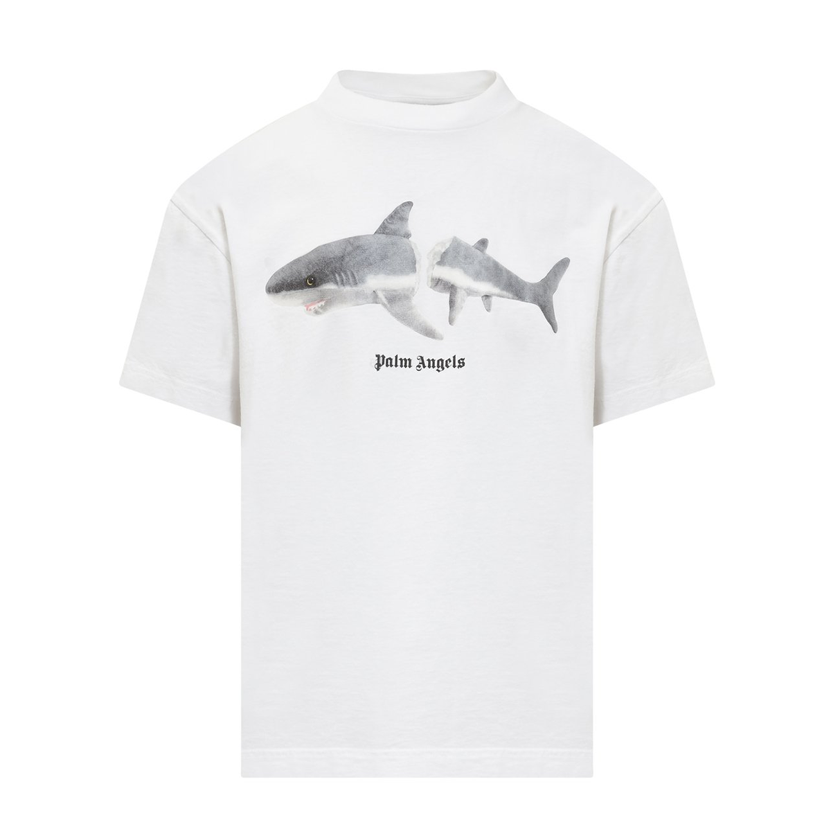 SHORT SLEEVES T-SHIRT IN WHITE WITH SHARK GRAPHIC PRINTED AT FRONT. "PALM ANGELS" LOGO PRINTED IN BLACK AT FRONT AND AT BACK. CREWNECK COLLAR.