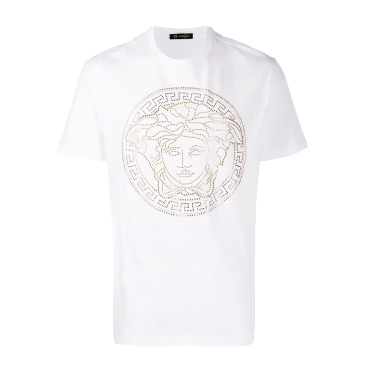 VERSACE MEDUSA MOTIF STUDDED T-SHIRT IN WHITE
